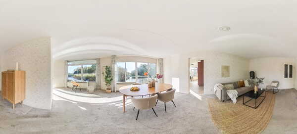 Via de deur met kleurrijk glas loopt u de L-vormige woonkamer in, met fenomenaal uitzicht over het water en de prachtige natuur. Deze woonkamer biedt genoeg ruimte aan een royale zithoek, eettafel en een plek voor werk of studie. Ook een indeling met een dubbele zithoek behoort tot de mogelijkheden.