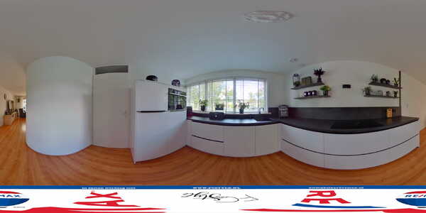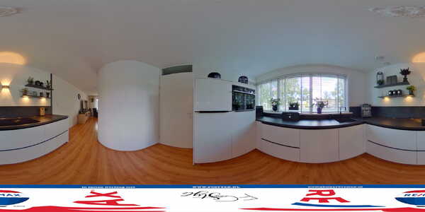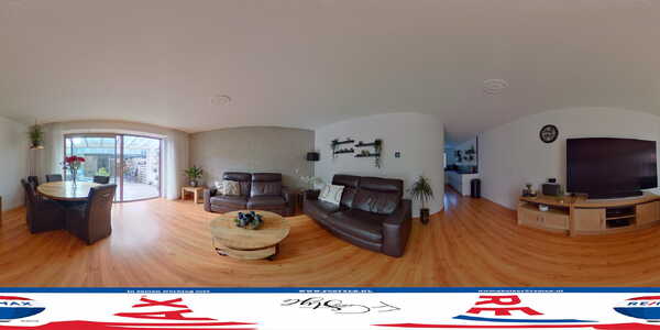 De halfronde muur is niet alleen zichtbaar in de keuken, maar ook in de woonkamer. Er ligt, net als in de hal, laminaat op de vloer en het geheel maakt een geweldige indruk. Een brede aluminium schuifpui geeft toegang tot de serre, gebouwd in 2017. Dit is een heerlijke ruimte met inbouwverlichting, een glazen schuifwand en elektrische verwarming.