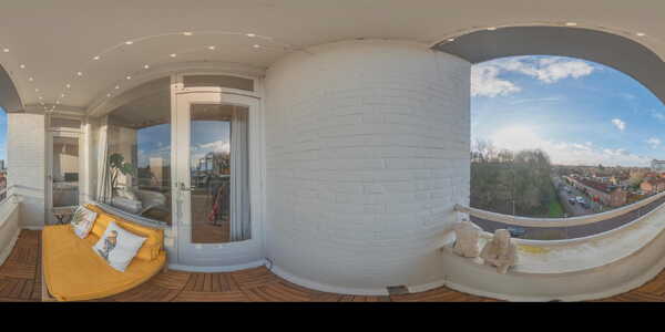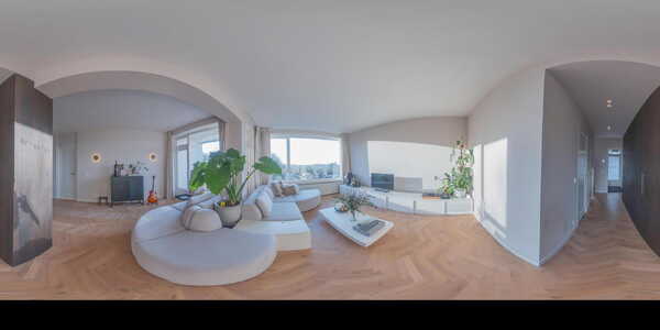 Via de trap of lift bereik je de in 2020 vernieuwde galerij die toegang geeft tot het hoekappartement op de vijfde etage. Vanuit de hal, waar zich de meterkast bevindt, loop je de ruime en lichte woonkamer binnen.