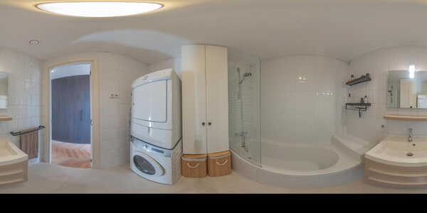 De badkamer is praktisch ingericht met een ligbad, wastafelmeubel en plek voor zowel een wasmachine als een droger. Het toilet is separaat en bevindt zich in de hal.