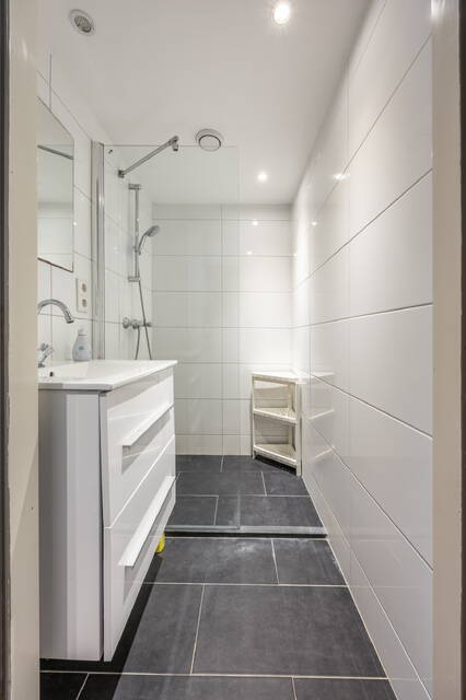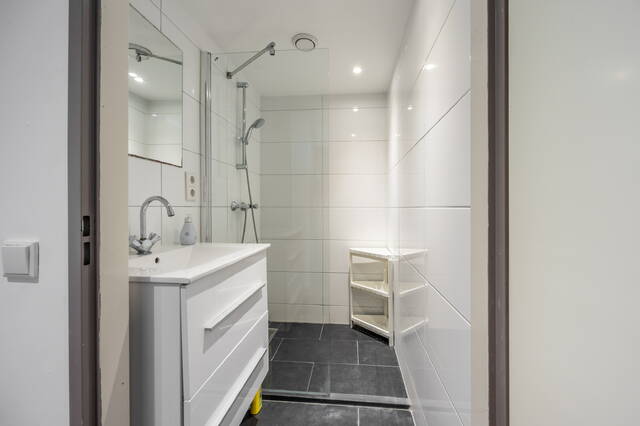 De badkamer is modern afgewerkt in wit met grijze vloertegels en voorzien van een inloopdouche, wastafelmeubel en mechanische ventilatie. Er is een separaat toilet in dezelfde stijl.