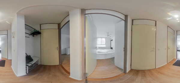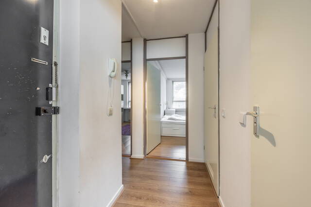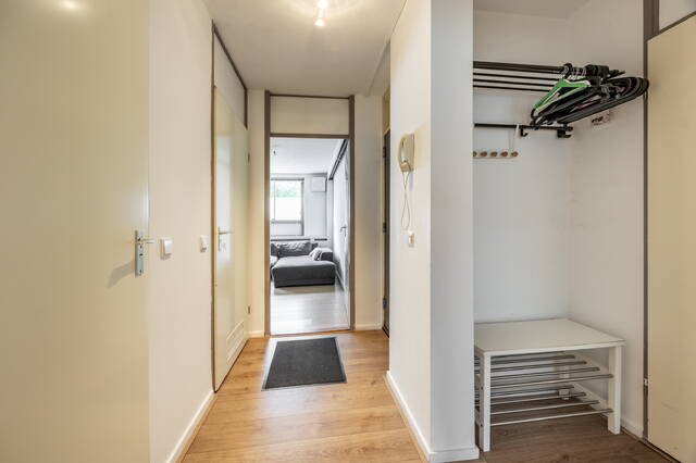 Via de gemeenschappelijke entree met intercom bereik je de voordeur van het appartement. De hal geeft toegang tot alle vertrekken.