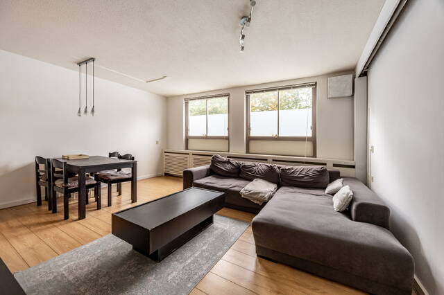 De lichte woonkamer van ca. 25 m² ligt aan de voorzijde en biedt ruimte voor zowel een zit- als eethoek. De grote ramen zorgen voor prettig daglicht.