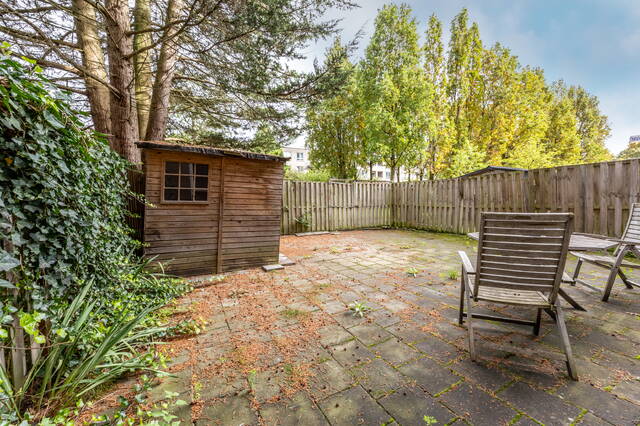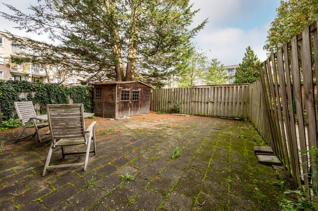 De achtertuin is circa 8 meter diep en gelegen op het noordoosten. Dankzij de vrije ligging geniet je hier van veel privacy. De tuin is grotendeels bestraat en voorzien van een houten berging.