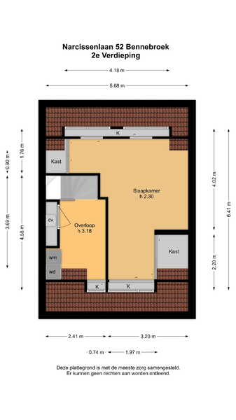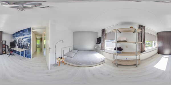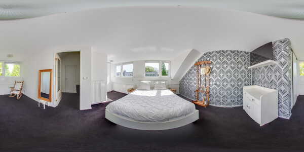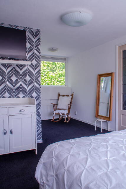 Met het plaatsen van twee dakkapellen is de ruimte op de tweede verdieping fors vergroot. Het resultaat is een volwaardige verdieping met een overloop/wasruimte en een ruime slaapkamer, die als master bedroom in gebruik is. Deze kamer heeft twee maatwerk kasten en bergruimte in de schuinten van het dak.