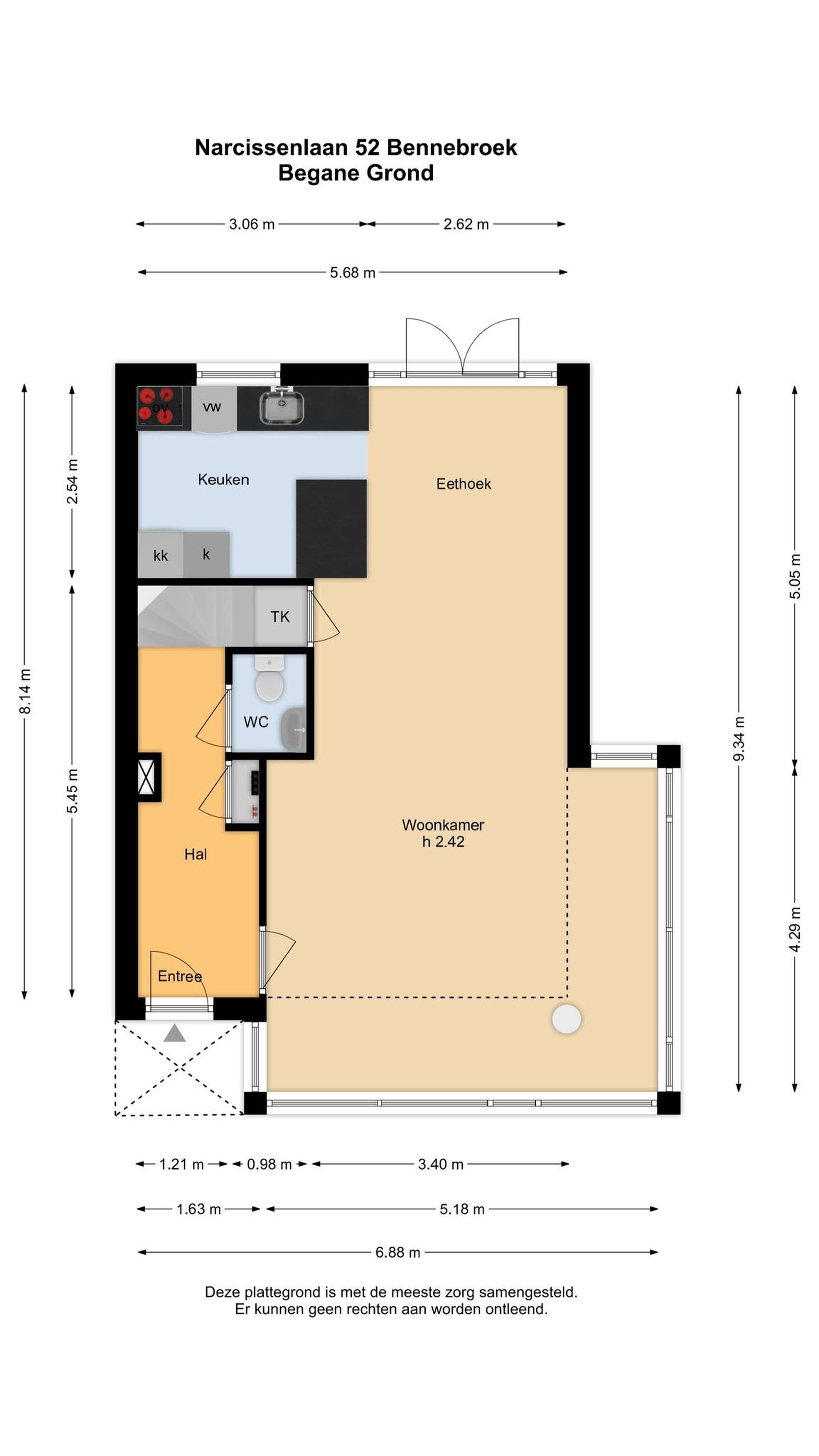 Wat een uitstraling heeft deze hoekwoning, met een overdekte entree en een erker aan twee zijden. Ook binnen is het een fantastisch huis, dus loop snel de hal in. Hier ziet u de meterkast, trapopgang en de toiletruimte. De kleur van het tapijt past goed bij de tegelvloer en in de toiletruimte hangt een fonteintje, met de aansluiting om een kraan te plaatsen.