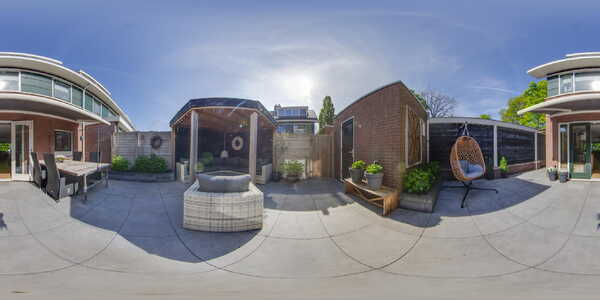Openslaande deuren in de woon-/eetkamer geven toegang tot de achtertuin, op het zuidoosten. Dit is een fantastische plek om te relaxen, loungen, barbecueën en te borrelen met familie of vrienden. In de stenen berging is ruimte voor de fietsen, net als onder de overkapping aan de zijkant van de woning. Verder heeft u de beschikking over een stijlvol overdekt terras en een groot zonnescherm boven het eetgedeelte.