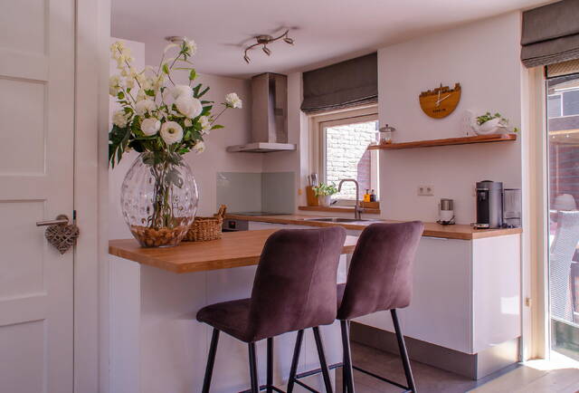 In 2010 is de open keuken vernieuwd, waarbij is gekozen voor een speelse indeling met een wandopstelling bij het raam, een hoge kastenwand en een ziteiland. De kunststof aanrechtbladen hebben de uitstraling van hout en alle benodigde apparatuur is ingebouwd: een inductie kookplaat, afzuigkap (direct naar buiten), een vaatwasser (2021), koelkast (2024), vriezer (2025) en een oven.