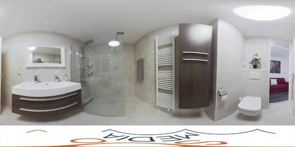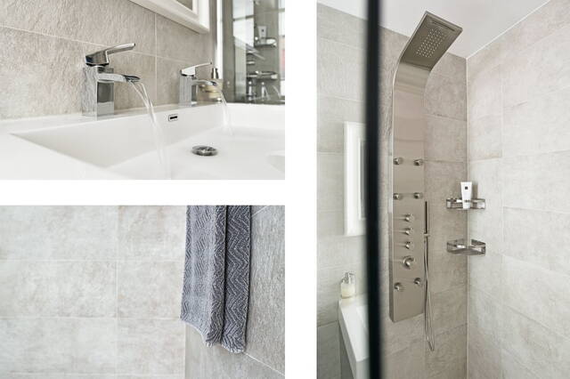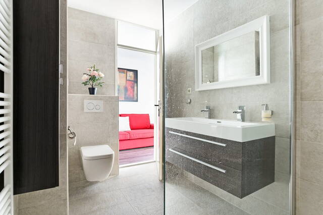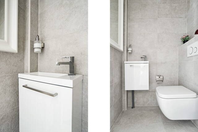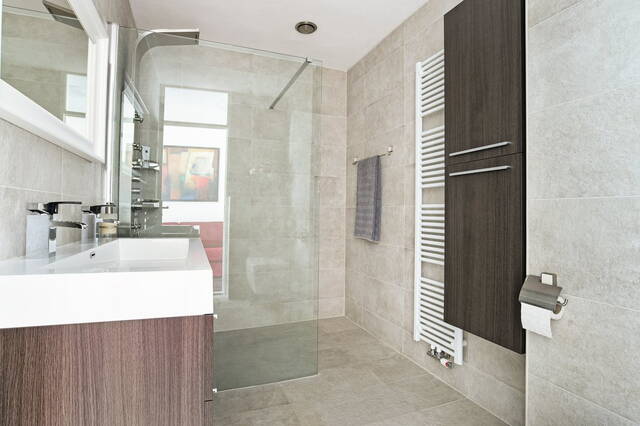 badkamer (2019) is werkelijk een lust voor het oog. Deze is voorzien van massagedouche, een dubbele wastafel met meubel om de verkeersdrukte in de ochtend te ontzien, een zwevend closet en een designradiator.
