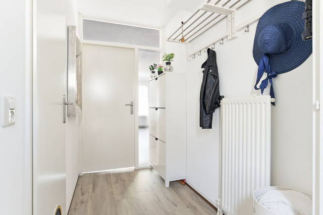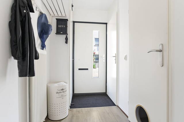 Entree, ruime hal, volledig vernieuwde meterkast, eigentijds zwevend closet, provisiekast cq. wasruimte volledig betegeld. De royale woonkamer met grijsgetinte pvc vloer met brede planken heeft uitzicht op de zonnige fraaie aangelegde tuin met elektrisch zonnescherm.