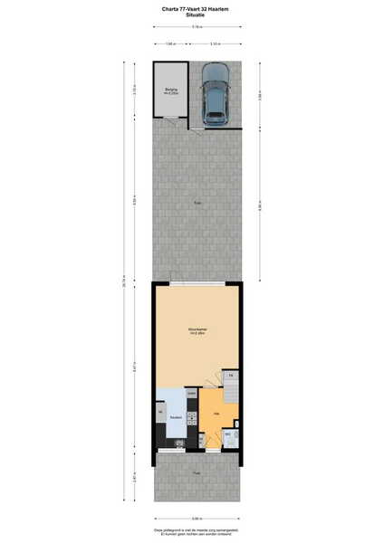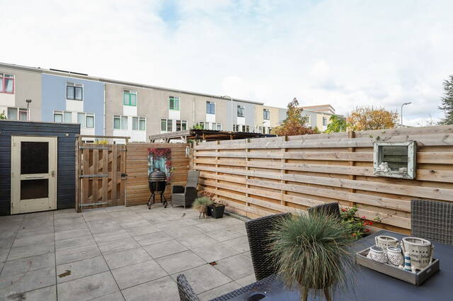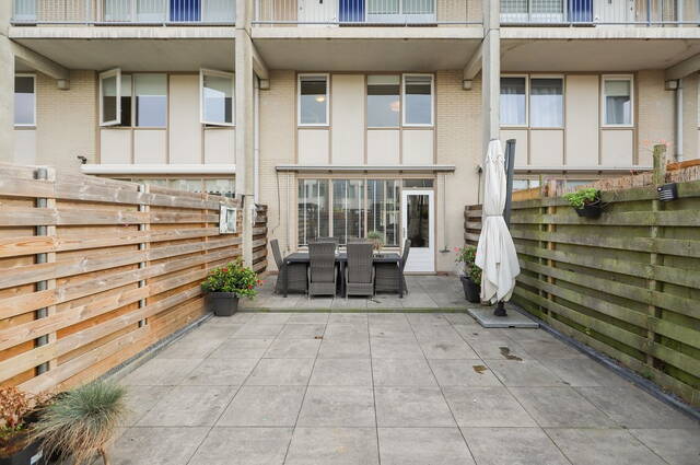 Vanuit de woonkamer bereikt u de diepe tuin, gelegen op het zonnige westen. Hier geniet u met name in de middag en avond van de zon. Groot pluspunt is de parkeerplaats op eigen terrein; zo hoeft u nooit meer te zoeken naar een parkeerplek. Naast de parkeerplaats is een houten berging, bijvoorbeeld voor de fiets. De tuin is geheel bestraat met grote, stoere tegels en de schuttingen aan beide zijden zorgen voor privacy.