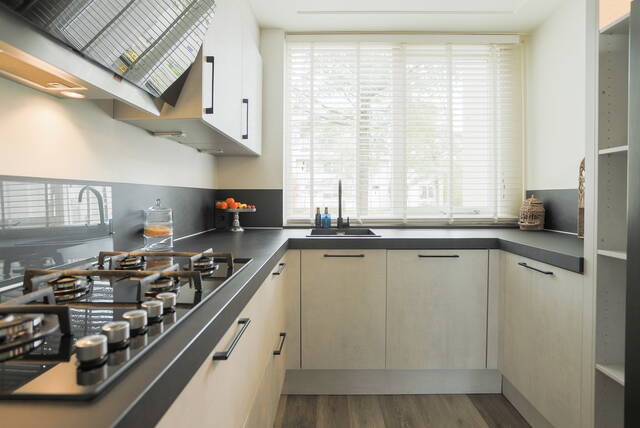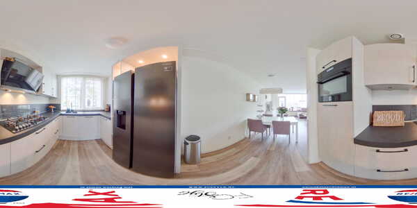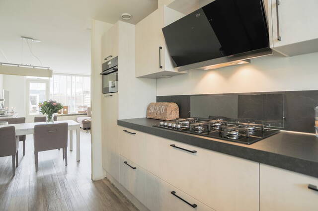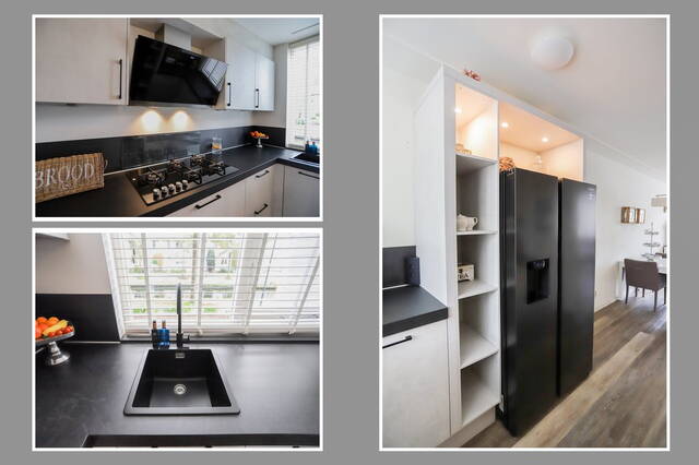 Aan de voorzijde is de prachtige keuken met een in 2019 vernieuwde U-opstelling, voorzien van alle benodigde inbouwapparatuur: een 5-pits gaskookplaat, afzuigkap, vaatwasser en een combimagnetron. Er is een nis om een grote koel-/vriescombinatie neer te zetten en door het grote raam kijkt u naar de rustige straat met het water als achtergronddecor.