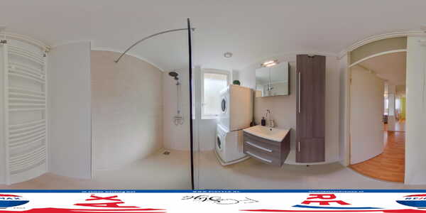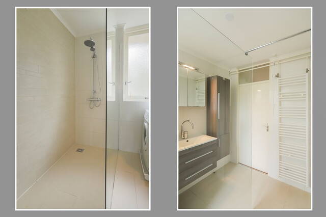 De luxe badkamer is slechts enkele jaren oud en ingedeeld met een inloopdouche, wastafelmeubel, wandradiator en een plek voor de wasmachine. Zowel de wanden als de vloer zijn geheel betegeld en het raam in de voorgevel zorgt voor licht én ventilatie.