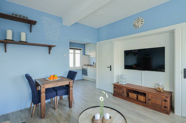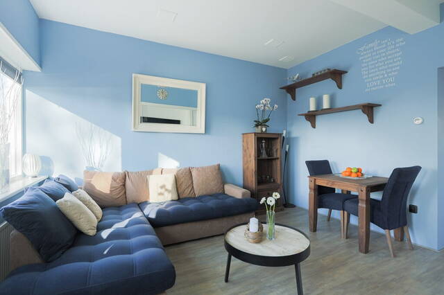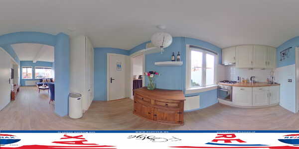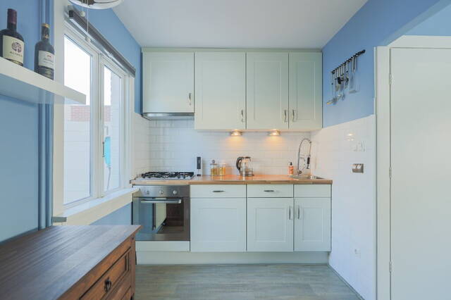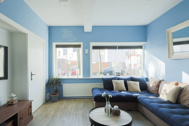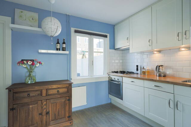 De frisse kleuren op de muren en de grote ramen zijn kenmerkend voor deze woonkamer. Er is genoeg ruimte voor een grote hoekbank, tv-meubel en een eettafel. In deze woonkamer geniet u van het uitzicht naar de leuke straat met hoge bomen. Vanuit de woonkamer ziet u de halfopen keuken met een mooie keukenopstelling (2005), voorzien van diverse inbouwapparatuur: een gaskookplaat, afzuigkap, oven, vaatwasser en een koelkast. De keuken vormt een mooi geheel met de woonkamer vanwege de laminaatvloer en de blauwe kleur op de muren.