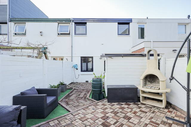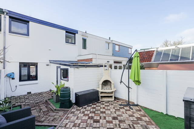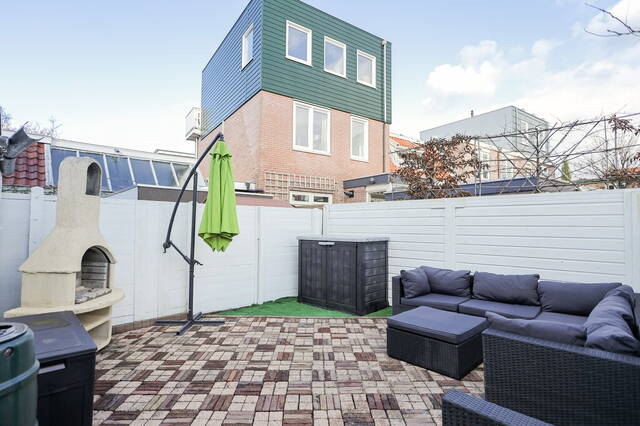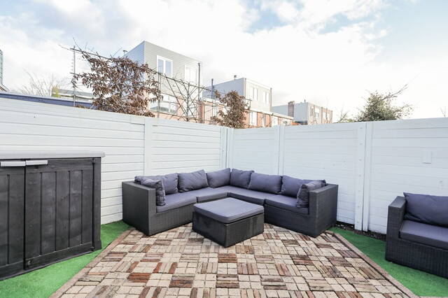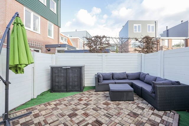 In de achtertuin is sierbestrating gecombineerd met kunstgras en de schuttingen zijn in een witte kleur geschilderd; hierdoor lijkt de tuin optisch nog groter. Buiten barbecueën en met een drankje in de zon zitten wordt onderdeel van het dagelijks leven als u de nieuwe bewoner wordt van deze mooie woning in de Indische Buurt Noord.