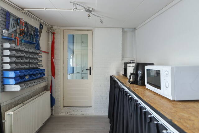 In de keuken ziet u twee deuren; de linkerdeur gaat naar een portaal met de toiletruimte en de rechterdeur geeft toegang tot een ruime berging/bijkeuken. Hier is onder andere plek voor extra keukenapparatuur en een werkbank met gereedschap. De berging is verwarmd, heeft elektra, een raam voor het nodig daglicht en een deur naar de tuin.