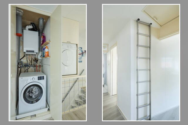 Achter een van de deuren in de woonkamer is de trap naar de eerste verdieping. Dankzij de slimme indeling zijn op deze verdieping een overloop, drie slaapkamers, de badkamer en een aparte ruimte voor de wasmachine. Er is bij het trapgat zelfs een mooie plek gemaakt voor de wasdroger; dat is nog eens efficiënt met de ruimte omgaan.