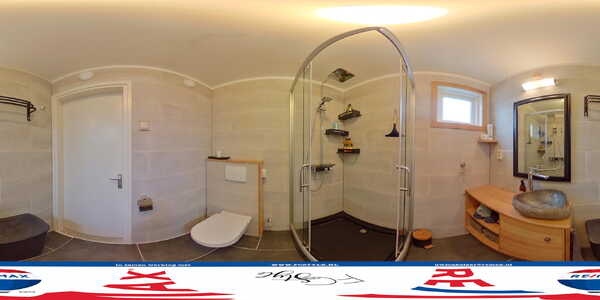 De badkamer is vernieuwd in 2018 en ingedeeld met een grote douche, toilet en een houten wastafelmeubel. U ziet dat deze badkamer is gemaakt met mooie materialen: grote tegels op de wanden, een regendouche met losse handdouche en een prachtige waskom.