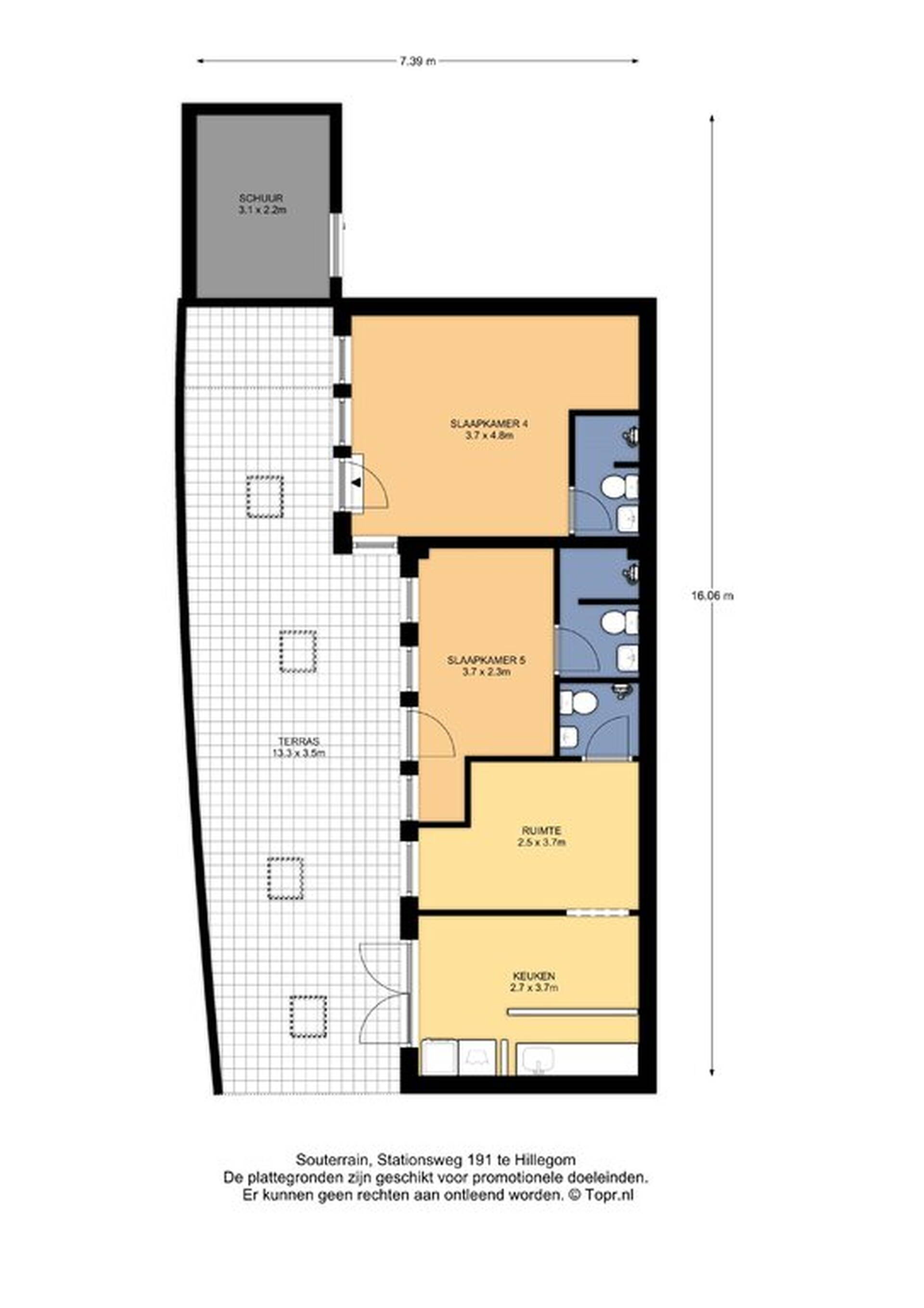 Verrassend is het souterrain; ruim van formaat en voor diverse doeleinden te gebruiken. Het souterrain is al jaren in gebruik ten behoeve van Air BnB en heeft twee slaapkamers, twee badkamers, een keuken en een gemeenschappelijke ruimte met toegang tot een toiletruimte. Beide slaapkamers zijn te bereiken via de houten overkapping, voorzien van meerdere lichtkoepels. Op deze wijze hoeven gasten niet in de privéwoning te komen.