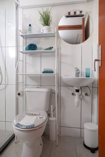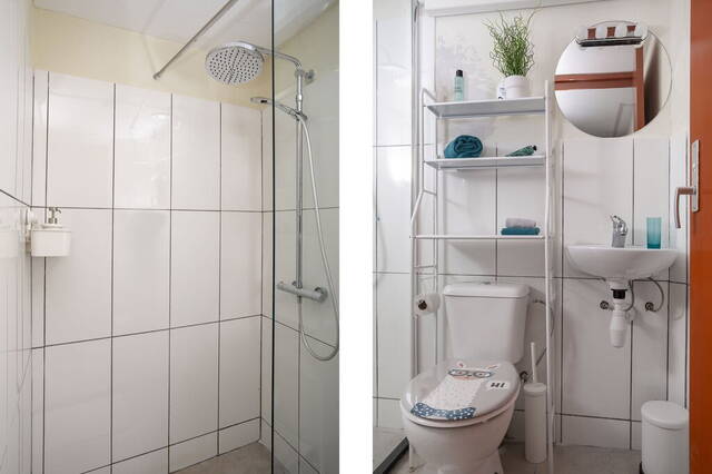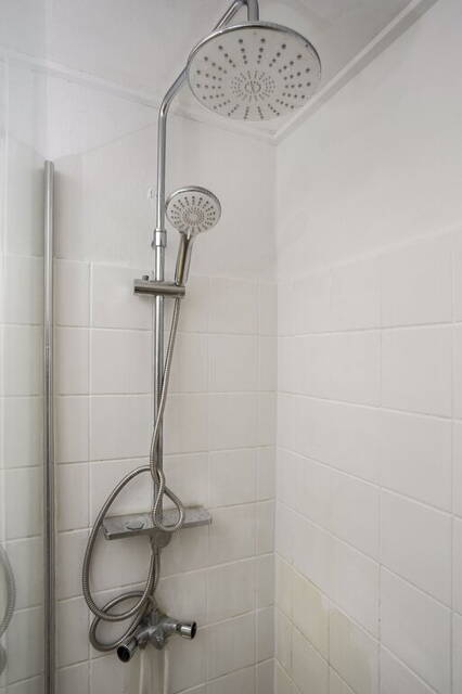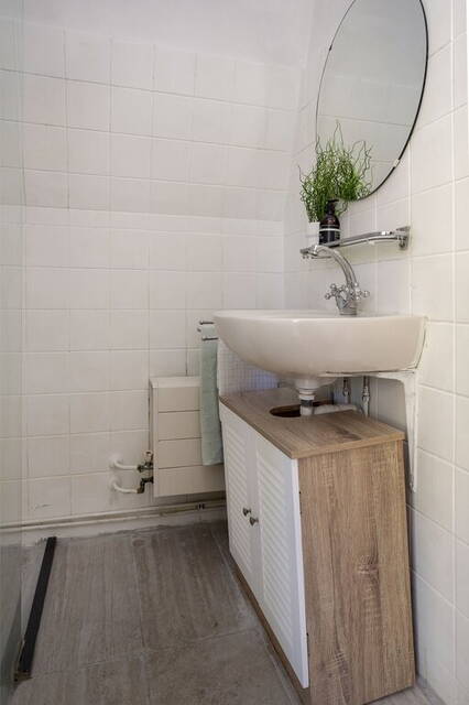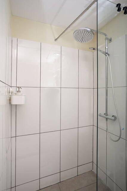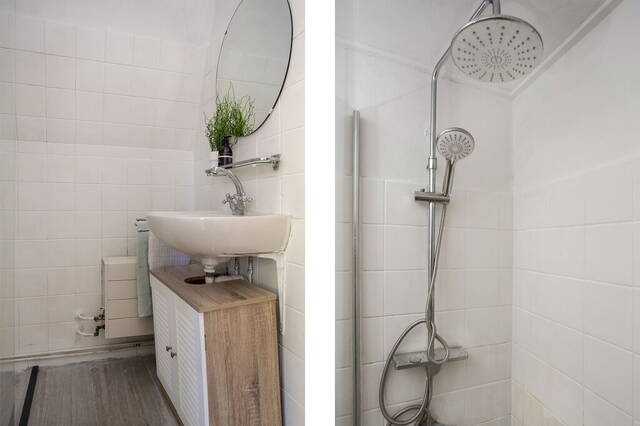De badkamer is ingedeeld met een douche en een wastafel. Tegenover de badkamer is de toiletruimte, te bereiken vanaf de overloop.