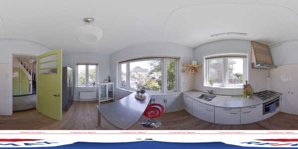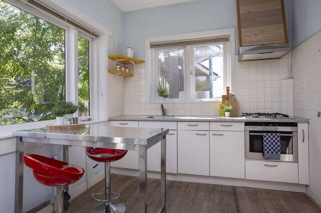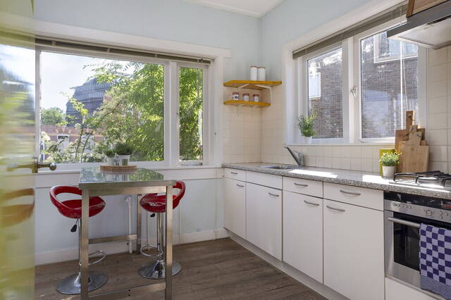 De dichte keuken heeft ramen aan drie zijden, ruimte voor een (ontbijt)tafel en een wandopstelling met diverse inbouwapparatuur: een gaskookplaat, afzuigkap en een combioven. Hier ervaar je het genot van een hoog plafond en zorgt de lichtblauwe kleur voor een vrolijk accent.