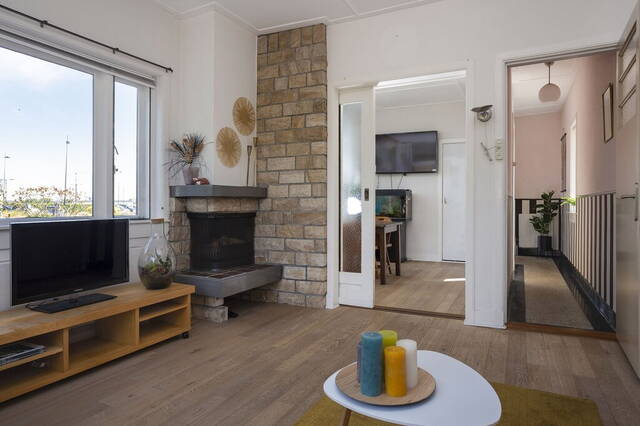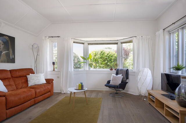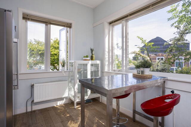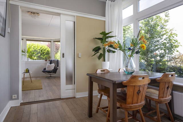 Aan de achterzijde zijn de woonkamer en eetkamer, gescheiden door middel een schuifdeur. De woonkamer heeft een open haard, lichte erker en een houten vloer. Door de grote ramen valt veel daglicht naar binnen en tegelijk heb je mooi uitzicht naar de tuin en de levendige omgeving. Net als in de woonkamer ligt in de 2e woon/eetkamer een houten vloer met karakter. In de eetkamer is voldoende plek om met vrienden en familie te genieten van een gezellig etentje.
