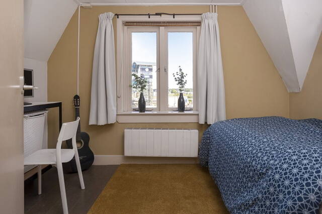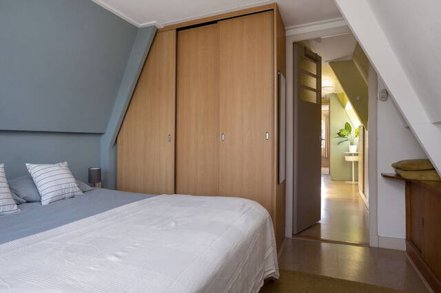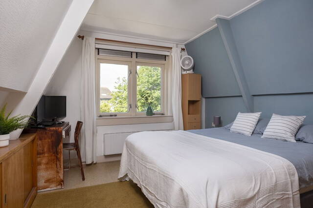 Dankzij de dakkapel is de overloop een stuk ruimer én lichter geworden. Er zijn op deze verdieping drie slaapkamers, een badkamer en een separate toiletruimte. De steile, schuine daken zorgen voor een aangename sfeer en de kamer aan de achterzijde heeft een vaste garderobekast.