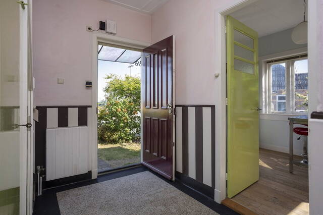 Via het kleine trapje kom je bij de voordeur van deze sfeervolle woning. De ruime ontvangsthal geeft onder andere toegang tot de toiletruimte met fonteintje, een bergkast, de woonkamer, eetkamer en de keuken.