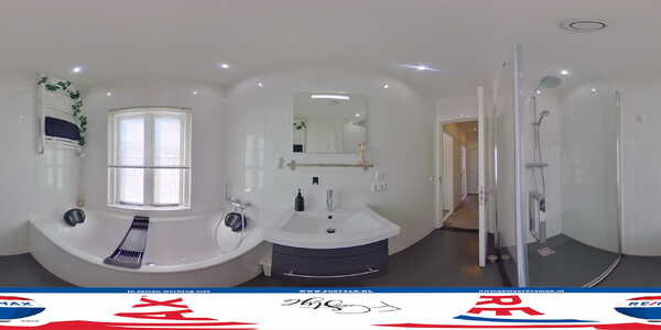 De moderne badkamer (2019) is fraai ingedeeld met een ligbad, aparte douche, een handdoekenradiator en een breed wastafelmeubel. Het bad is een heerlijke ruimte om tot rust te komen, met fijn lichtinval door het grote raam.