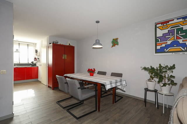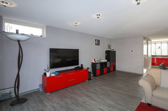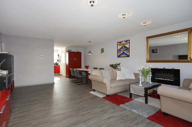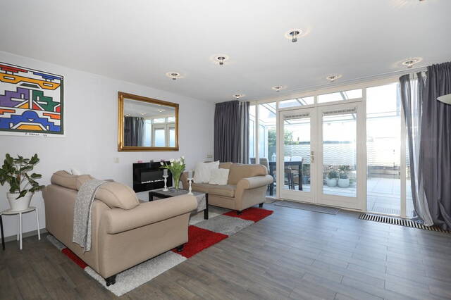 De keuken staat in open verbinding met de uitgebouwde woonkamer; een ruime en lichte leefruimte met openslaande deuren naar de aangebouwde serre. De onderhoudsvriendelijke plavuizenvloer heeft de uitstraling van hout wat de woonkamer een aangename sfeer geeft, evenals de mooie verlichting bij de aanbouw. In de woonkamer is de deur naar het portaal met de trap naar de eerste verdieping en de toiletruimte met fontein.