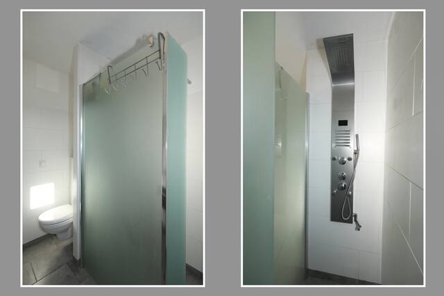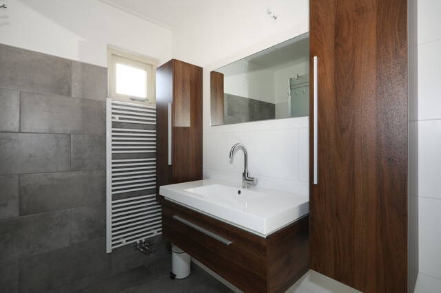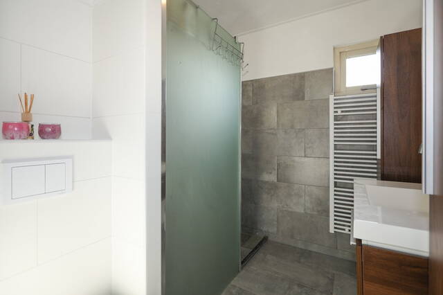 De luxe badkamer is ingedeeld met een inloopdouche, wandradiator, een tweede toilet en een modern wastafelmeubel met twee hoge kasten en een brede lade. De wanden in de badkamer zijn deels betegeld en deels gestuct en de mooie kleuren zorgen samen met de luxe douchekolom voor de absolute wow-factor.