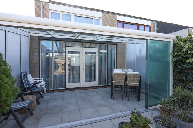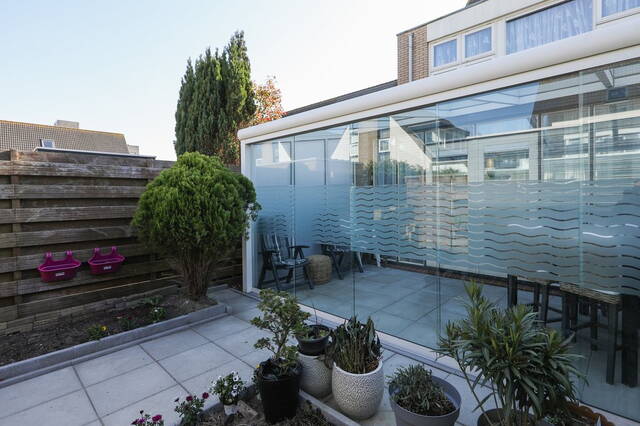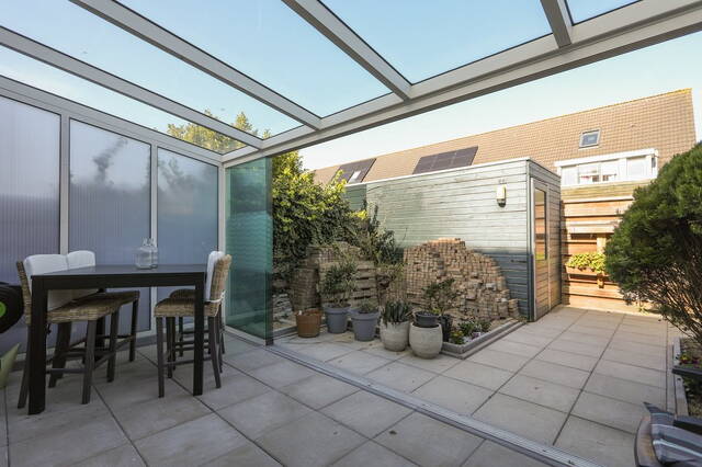 Via de schuifpanelen in de serre heeft u toegang tot de onderhoudsvriendelijke achtertuin, gelegen op het noordoosten. Achter in de tuin is de berging en er is een poort naar de gemeenschappelijke achterom. De achtertuin is grotendeels bestraat waardoor u volop ruimte heeft om in de zon of schaduw een plekje te zoeken.