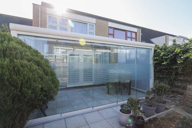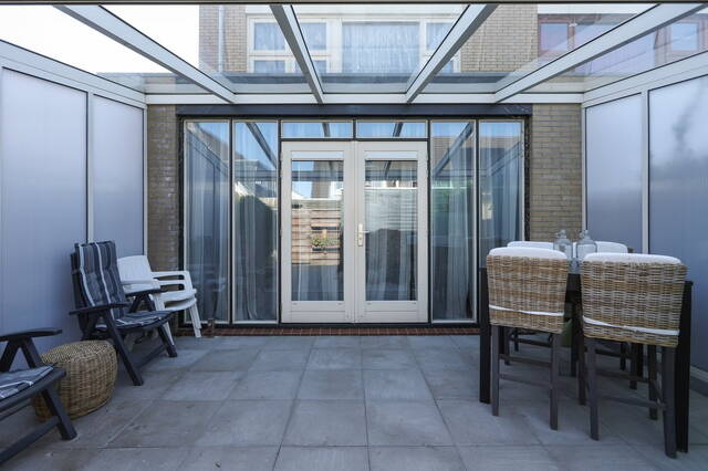 De serre is in 2019 gebouwd en feitelijk een verlengstuk van de woonkamer. Zodra de eerste zonnestralen zich laten zien is het hier fantastisch zitten. Dankzij de glazen schuifpanelen kunt u kiezen om ‘binnen’ of ‘buiten’ te zitten.