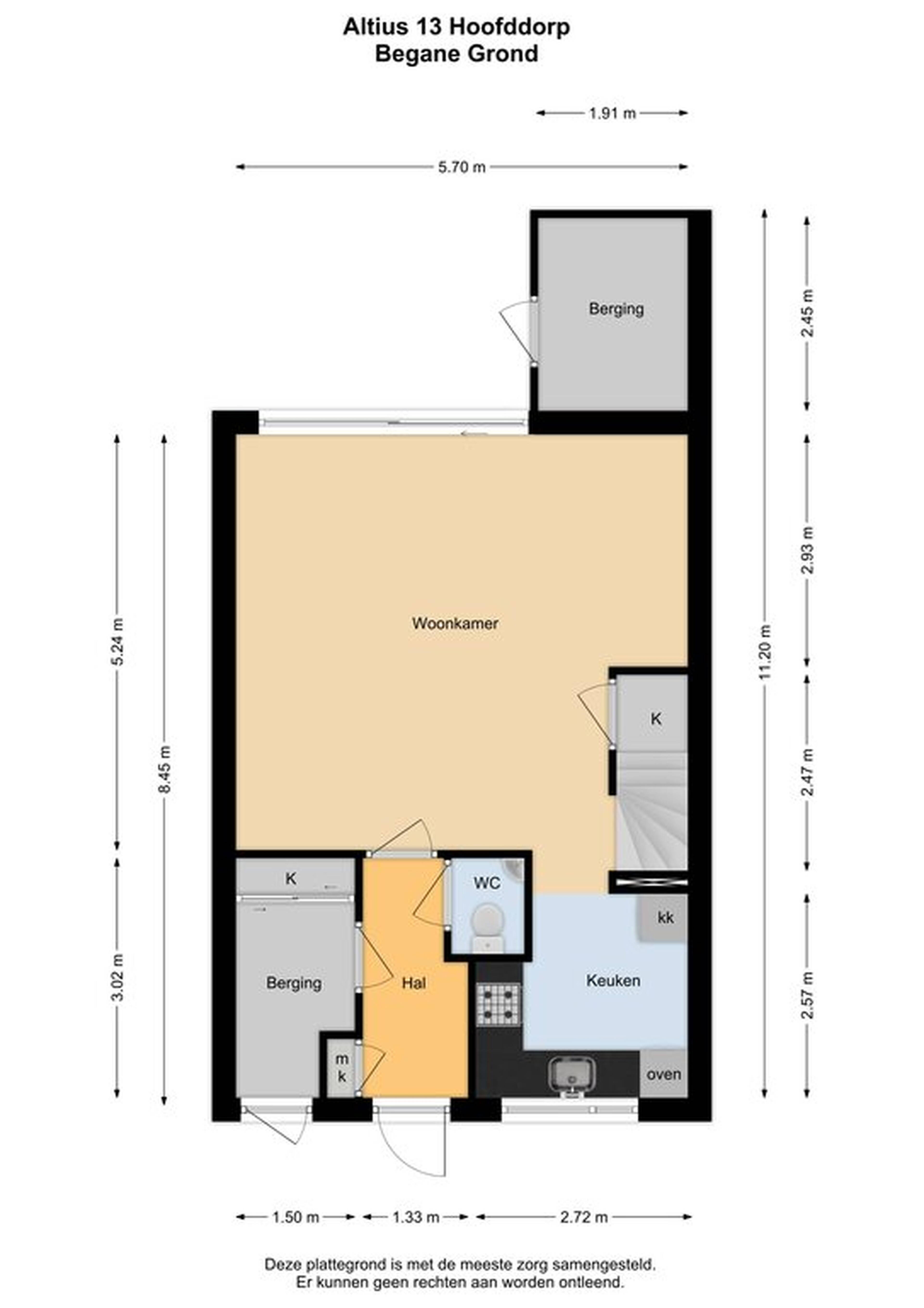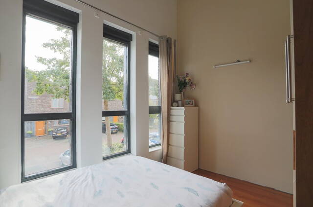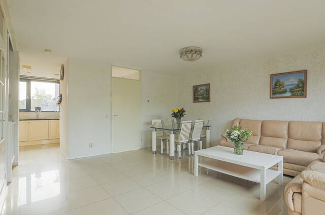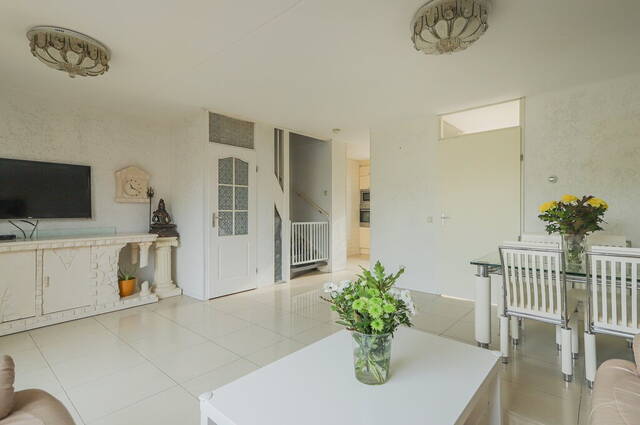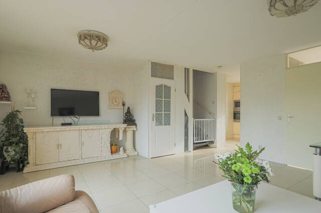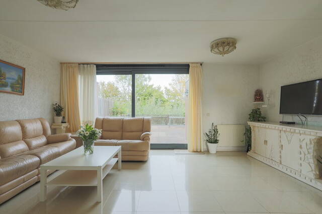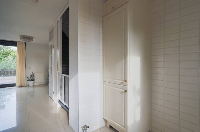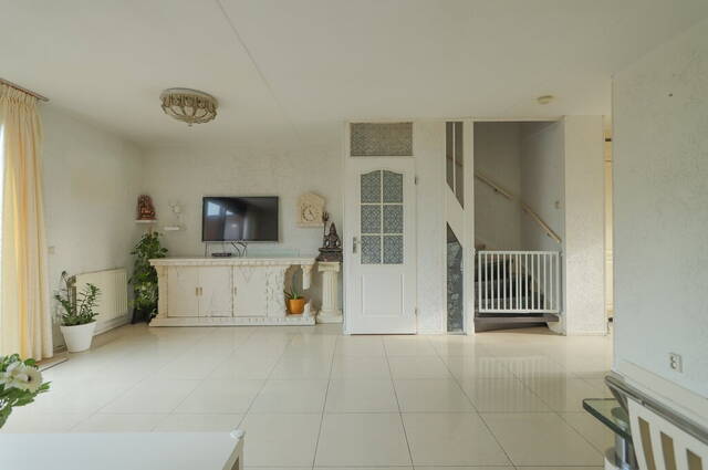 De woonkamer is maar liefst 5.70 meter breed en heeft een grote schuifpui naar de diepe achtertuin. In de hoek van de woonkamer is de trap naar de eerste verdieping, voorzien van een praktische bergkast. Er is genoeg ruimte voor een grote zithoek, een eettafel en een tv-meubel waarbij de grote ramen in de schuifpui zorgen voor veel lichtinval.
