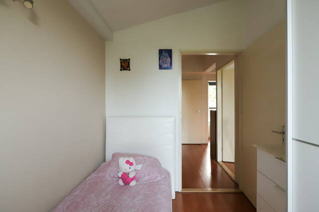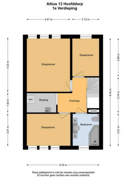 Op de eerste verdieping zijn de overloop, drie slaapkamers, de ruime badkamer en een inpandige berging annex wasruimte. Op zowel de overloop als de slaapkamers en in de berging ligt laminaat op de vloer. De hoge, schuine plafonds zorgen voor een speels effect en bieden de mogelijkheid voor een stoere hoogslaper in de kinderkamers.