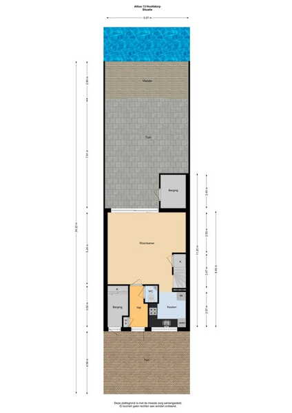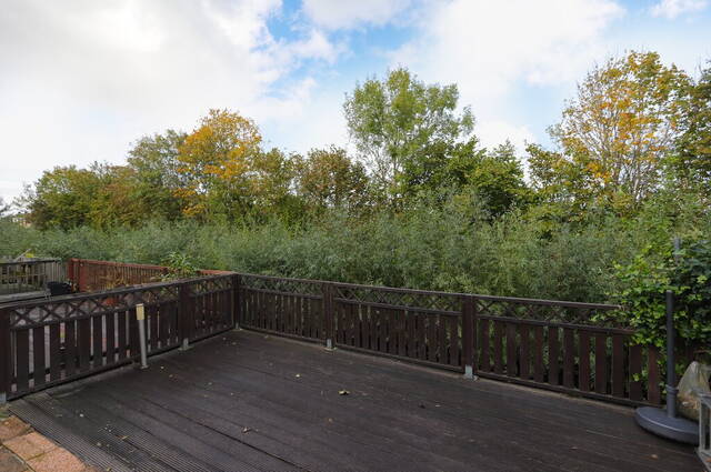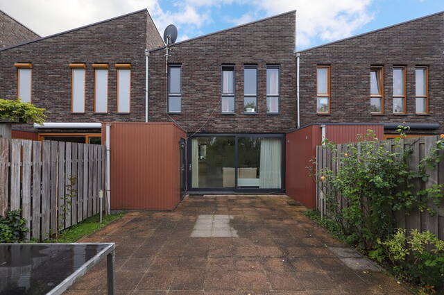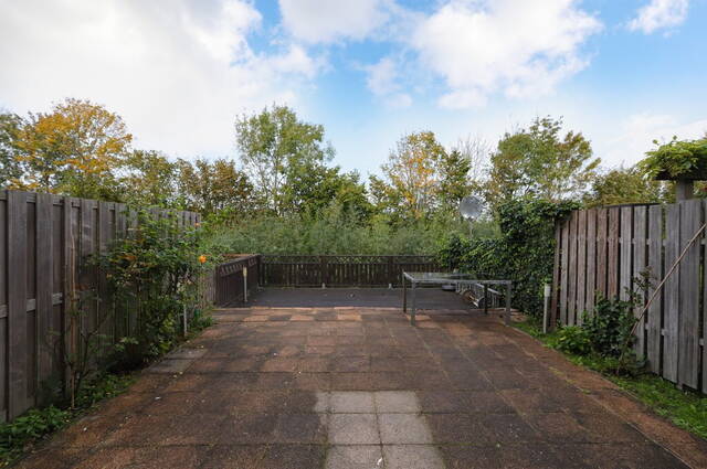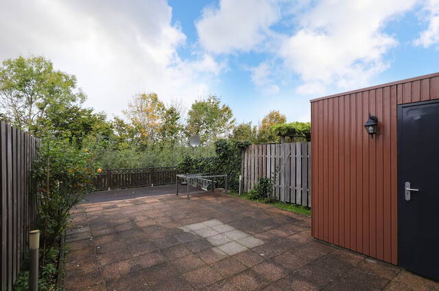 De achtertuin heeft een prachtige ligging aan het water en vrij uitzicht op het groen. Dankzij de diepte van de tuin en de lage bebouwing heeft u, ondanks de ligging op het noordwesten, volop zon. Houten schuttingen zorgen voor privacy en aan de waterkant is een houten terras gemaakt. Het merendeel van de tuin is bestraat waardoor u alle ruimte heeft voor een loungeset en een tafel met stoelen.
