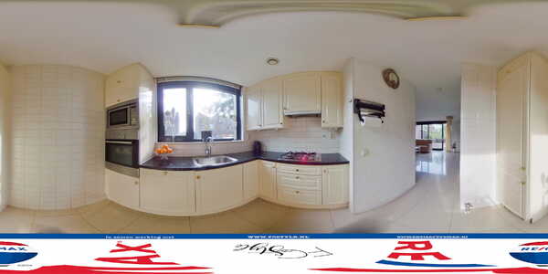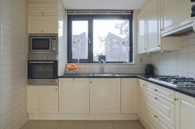 Naast de trap is de doorgang naar de keuken, voorzien van een hoekopstelling met diverse inbouwapparatuur: een gaskookplaat, afzuigkap, vaatwasser, koelkast, vriezer en een combimagnetron.