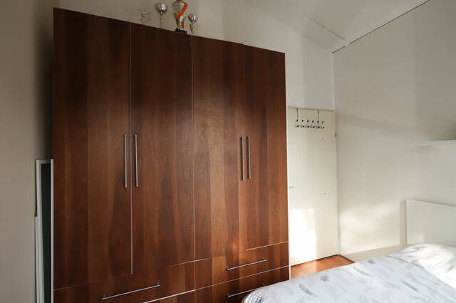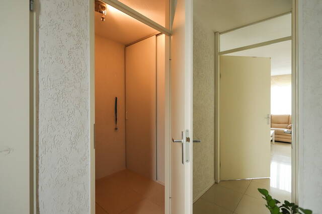 Aan de voorzijde ziet u twee deuren en dat is met een goede reden. De linkerdeur geeft toegang tot een fietsenberging, voorzien van een kastenwand met schuifdeuren. Deze berging is ook vanuit de hal van de woning te bereiken.