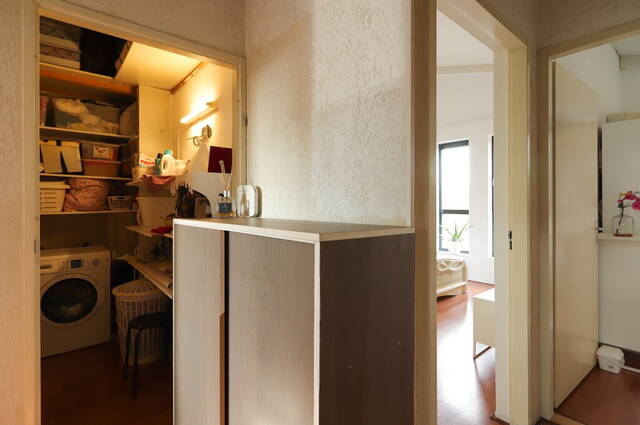De inpandige berging is een praktische ruimte met de cv-ketel en de aansluitingen voor de wasapparatuur. De ruimte is heel efficiënt benut dankzij de diverse wandplanken boven en naast de wasmachine.