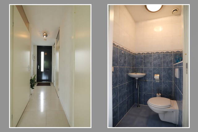 De andere deur leidt naar de hal van deze fijne, lichte woning. In de hal valt u oog op de plavuizen vloer, deze vloer ligt op nagenoeg de hele begane grond en past bij diverse interieurstijlen. Aan de rechterzijde zijn een nis voor de kapstok en de nette toiletruimte, voorzien van een fonteintje.
