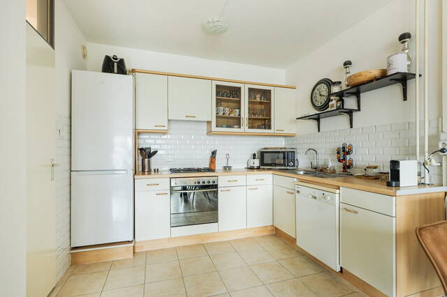 In de woonkamer valt uw oog op de open keuken, voorzien van een nette hoekopstelling met diverse (inbouw)apparatuur: een gaskookplaat, afzuigkap, oven en een vaatwasser. Op de vloer liggen plavuizen en de diverse onder- en bovenkasten bieden veel bergruimte.