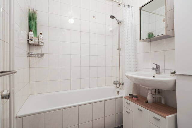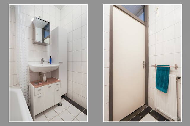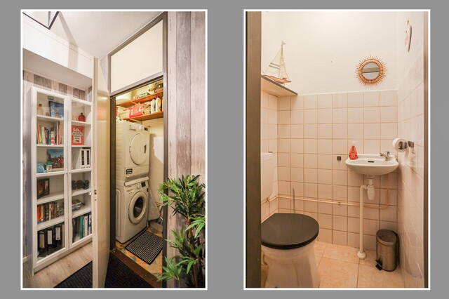 Naast de slaapkamer is de badkamer, te bereiken vanuit de hal. Hier kunt u genieten van een bad, die overigens ook functioneert als douche. Rechts in de badkamer is een wastafel voorzien van een spiegelkast, hoge kast en een onderkast. Zowel de wanden als de vloer zijn geheel betegeld in een neutrale kleurencombinatie. De inpandige berging is dé plek voor de wasmachine en droger.