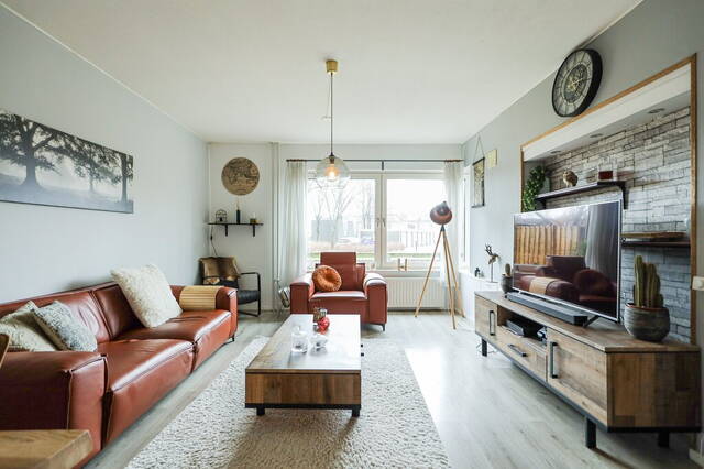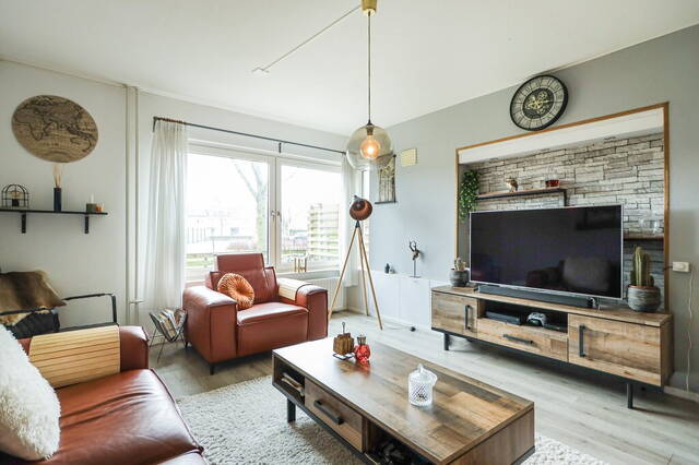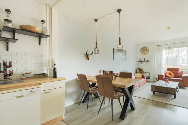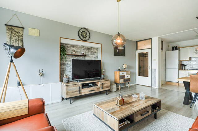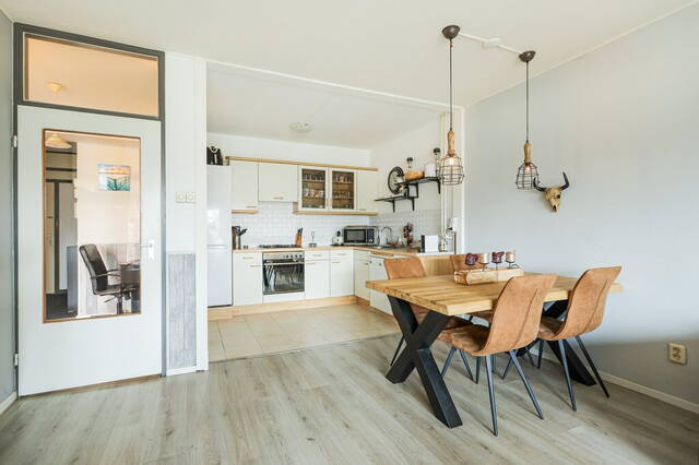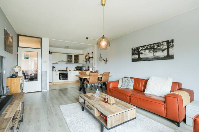 De woonkamer is een gezellige leefruimte met twee grote ramen aan de oostzijde en meer dan genoeg ruimte voor een zithoek, tv-meubel en een eettafel. De grijze laminaatvloer past goed bij de kleuren op de muren en bij diverse interieurstijlen. Ziet u zichzelf hier al wonen en genieten van het mooie uitzicht?