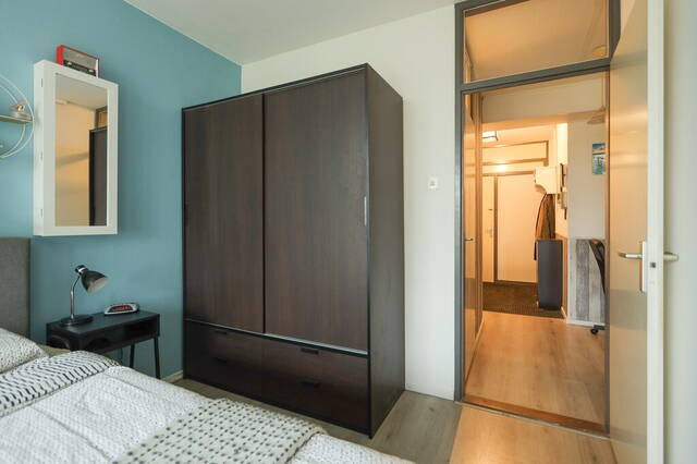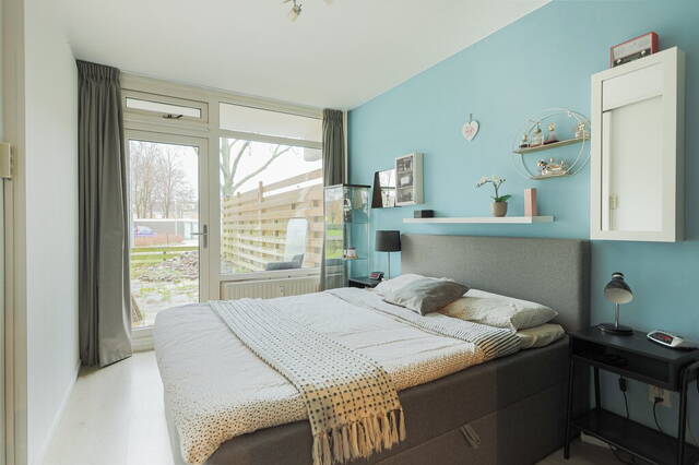 Het appartement heeft een ruime slaapkamer met een deur naar de tuin en genoeg ruimte voor een garderobekast plus een tweepersoonsbed. Op de vloer ligt hetzelfde laminaat als in de woonkamer en de hal.