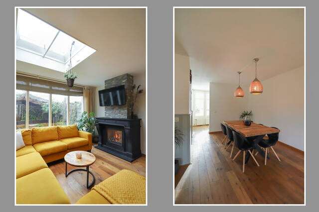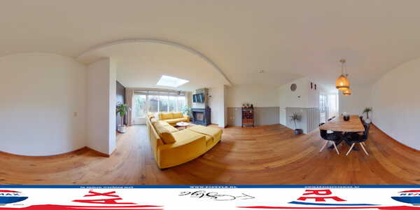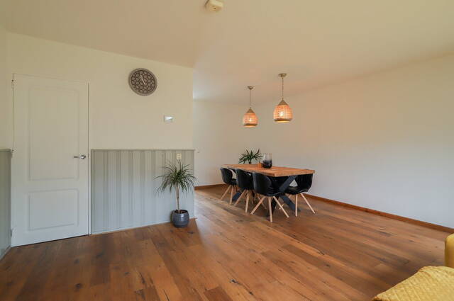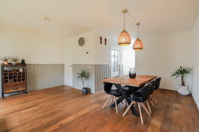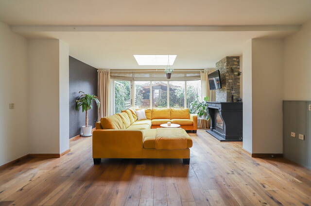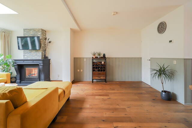Dankzij de uitbouw is de oppervlakte van de woonkamer flink vergroot. Blikvanger is de grote schouw met gashaard bij het zitgedeelte, waar de ramen en de lichtkoepel zorgen voor veel lichtinval. De rest van de woonkamer biedt ruimte aan een kast en een grote eettafel. Een deel van de wanden is voorzien van een lambrisering en er ligt een houten vloer.