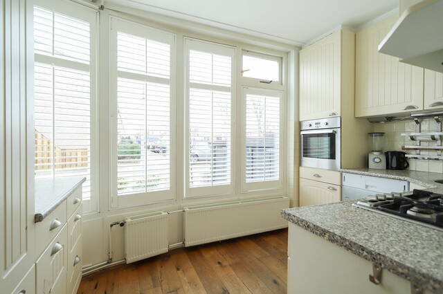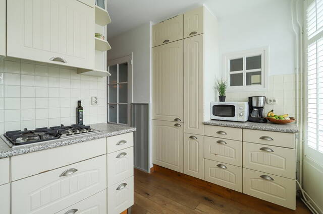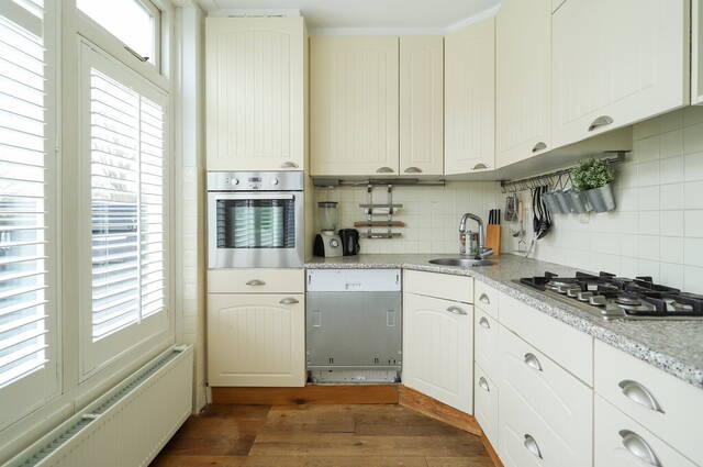 In de woonkamer is de doorgang naar de, lichte keuken waar de grote ramen zijn voorzien van shutters. De keukenopstelling heeft veel bergruimte in de onder- en bovenkasten en alle benodigde apparatuur is ingebouwd: een gaskookplaat, afzuigkap, vaatwasser, oven en een koel-/vriescombinatie. De woning biedt de mogelijkheid voor het wegbreken van de wand waardoor er ruimte ontstaat voor een keuken met kookeiland en u de keuken meer bij de woonkamer zou kunnen betrekken.