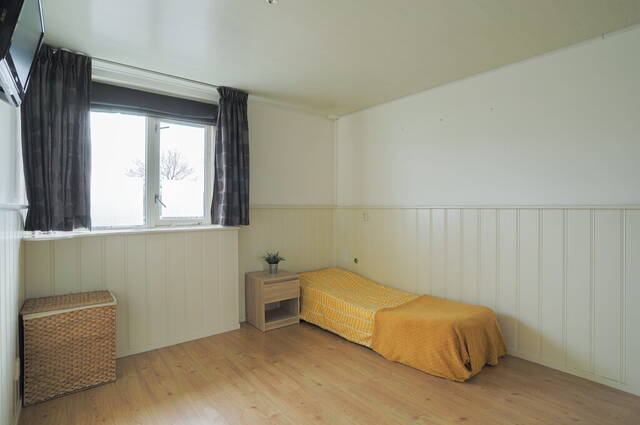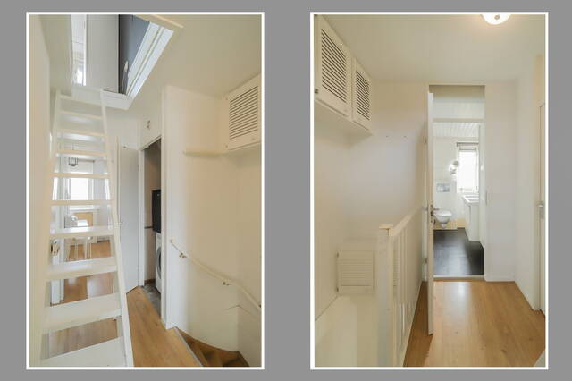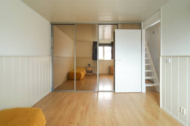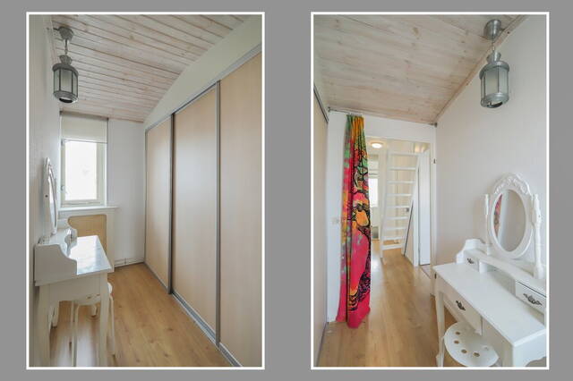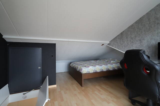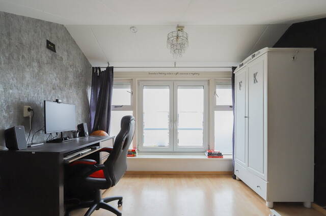 Dankzij de dakopbouw aan de achterzijde heeft deze leuke woning een vierde slaapkamer, te bereiken via een vaste trap. Er is een luik gemaakt voor privacy en de grote ramen aan de achterzijde zorgen voor veel lichtinval. Dit is niet alleen een fijne slaapkamer maar u kunt hier ook een prima werk- of studeerkamer van maken. Op de vloer ligt laminaat en er is veel bergruimte gemaakt in de schuinte van het dak.