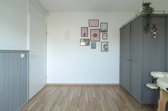 Vanaf de overloop zijn drie slaapkamers, de wasruimte en de badkamer te bereiken. De slaapkamer aan de rechter achterzijde is ingericht als kleedkamer, waar achter de grote schuifdeuren volop ruimte is voor kleding en schoenen. Ook de ruime slaapkamer aan de voorzijde heeft een vaste kastenwand; in totaal drie meter breed en met vier grote spiegeldeuren. Op zowel de overloop als in de slaapkamers ligt laminaat op de vloer.