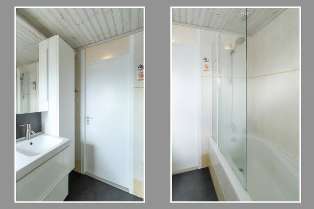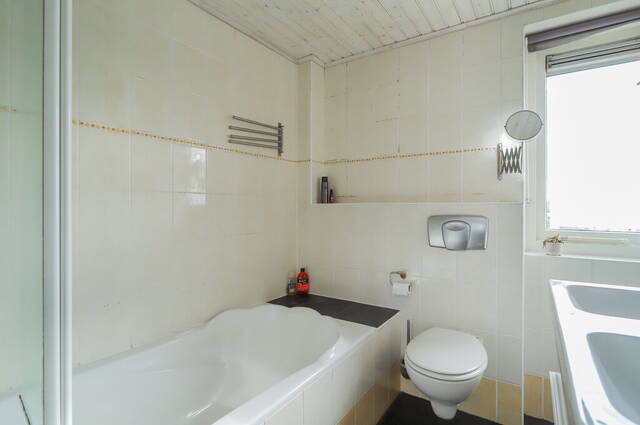 De badkamer is ingedeeld met een ligbad/douche combinatie, een tweede toilet en een groot wastafelmeubel met twee wastafels. Naast het raam hangt een handdoekenradiator en de wanden zijn geheel betegeld. Verder is er een aparte ruimte voor de wasmachine waardoor deze niet in de badkamer hoeft te staan.