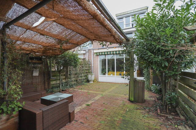 De diepte van de achtertuin (noordwest) is benut voor het bouwen van een tweede berging/hobbyruimte en een grote overkapping waar u heerlijk kunt zitten. Helemaal achter in de tuin zijn een stenen (fietsen)berging en een poort naar het achterpad. De beplanting in de achtertuin is merendeels groenblijvend en tegen de achtergevel hangt een brede zonwering.